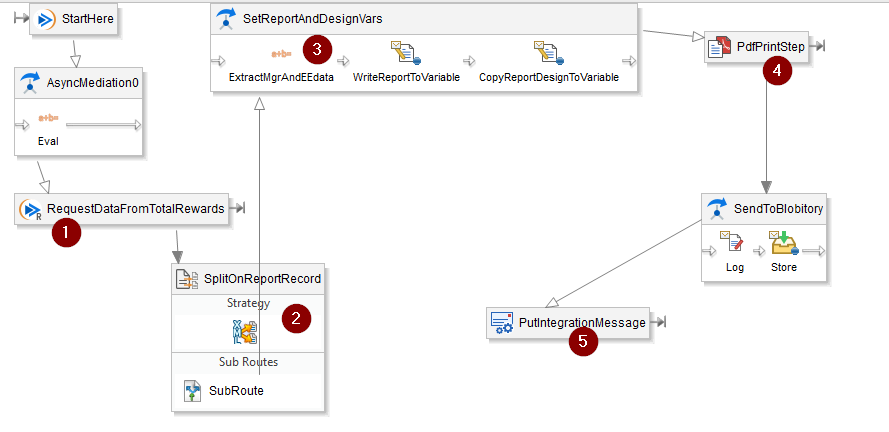 A boomerang integration was perfect here. We run a RaaS report as output from workday, split it up, grab some info from the report about the manager, process a BIRT step, and put it in the W: Drive via the PIM. Here's how it looks: