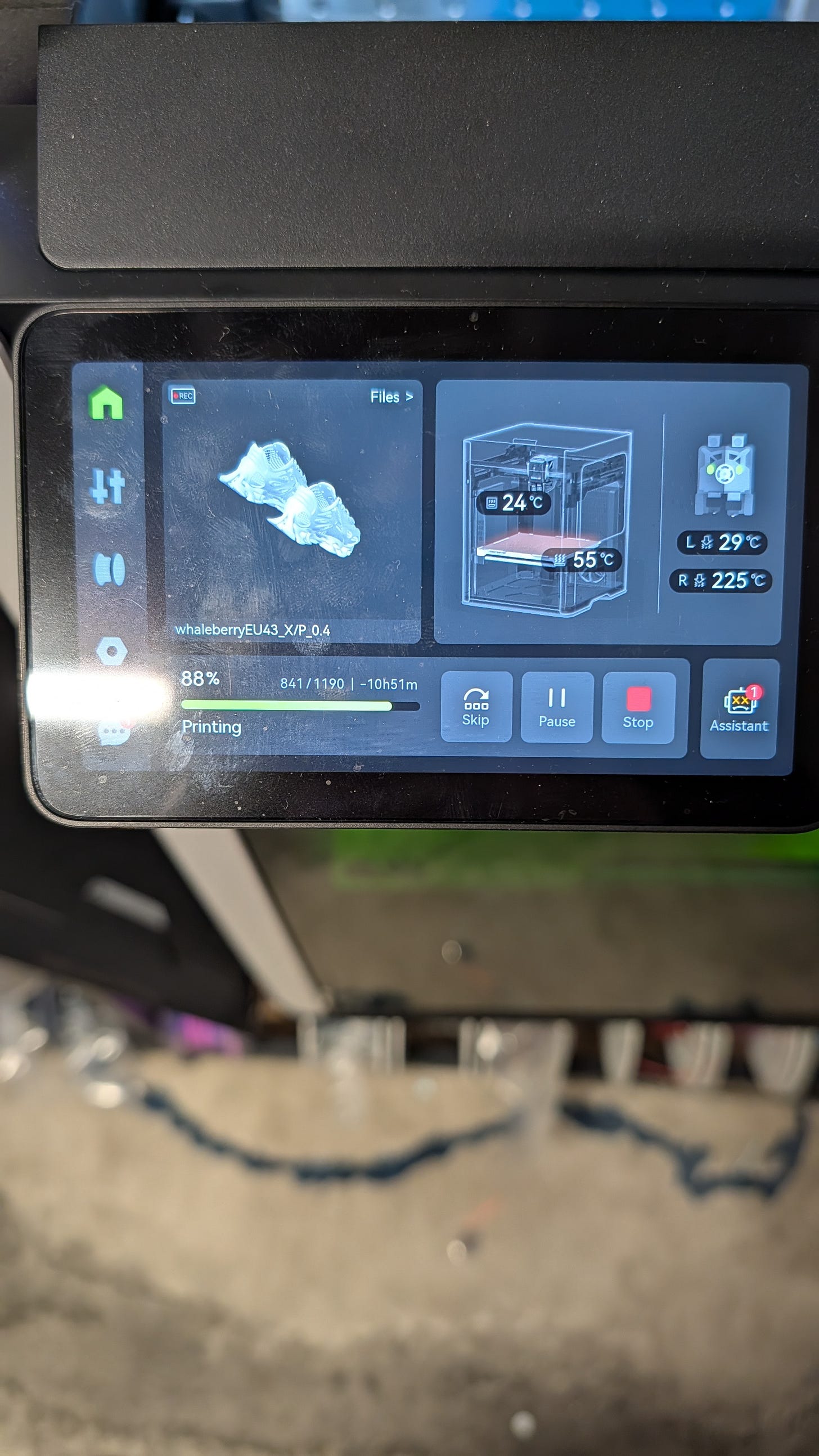 For the last 3.5 days, this machine has been depositing molten plastic to build a complex pair of "Whaleberry" shoes: a rigid white skeleton fused with a flexible "Frozen" blue skin.