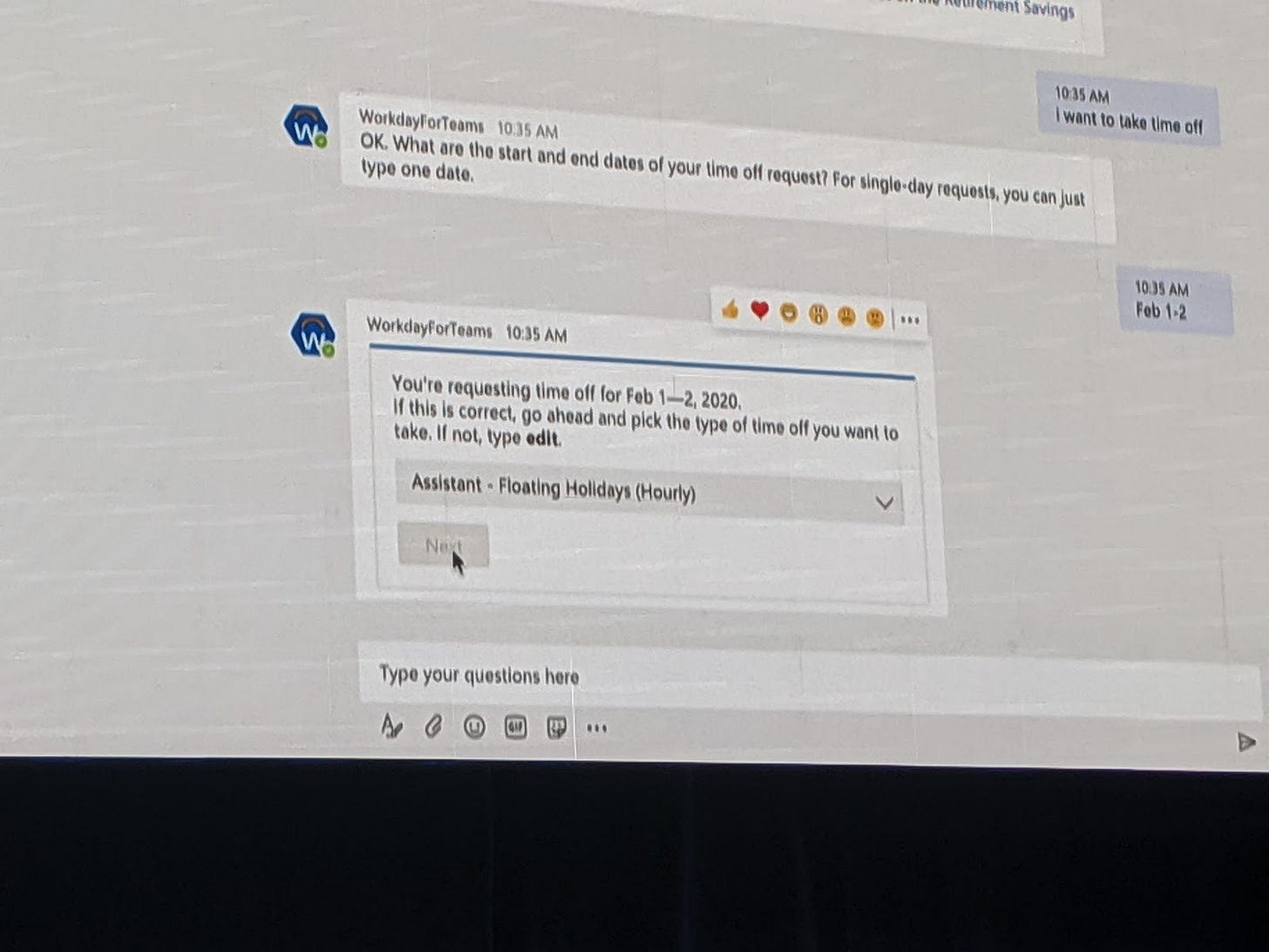 For the Slack/Teams integration, which is in a limited use beta, there's really only 4 use cases: Time Off, a "whois" type integration, interview feedback, and "guides" - which is essentially a deep link into Workday. What I've been screaming about with regards to bots is that this is Transformational in HR. One of the issues we've experienced in HRIS is that in ESS/MSS this usually means "learning another system" or "lots-o-change management". Placing ESS/MSS in a natural work space (like Slack) eliminates the change aspect. Just ask the bot when you want to take off, or your balance.